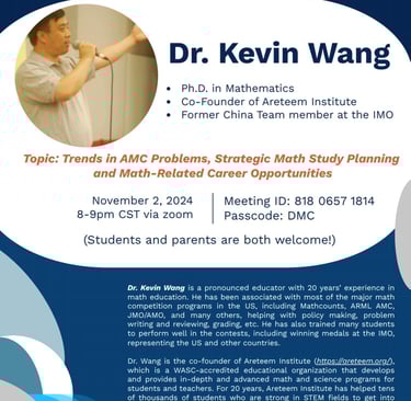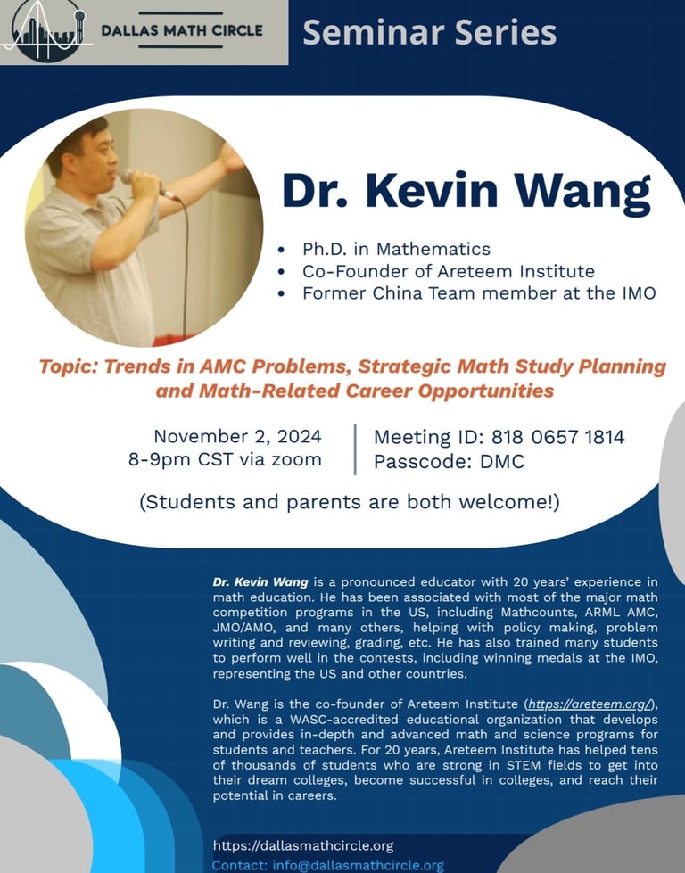 It is our pleasure to host Dr. Kevin Wang at our circle, who gave a very informative talk on math-related careers and trends in AMC competitions. We extend our deepest gratitude to him for sharing his time, knowledge, and insights with us. We hope the seminar participants have learned from his insightful talk.